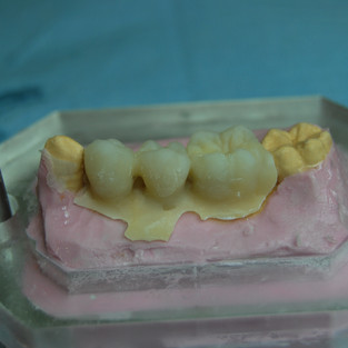 (12,13,14 imagen) (12 imagen) Modelo maestro de la prótesis a realizar. (13 imagen) Puente de 34-36 modelado en cera. (14 imagen) Puente en cera, modelado obteniendo todos los parámetros oclusales.